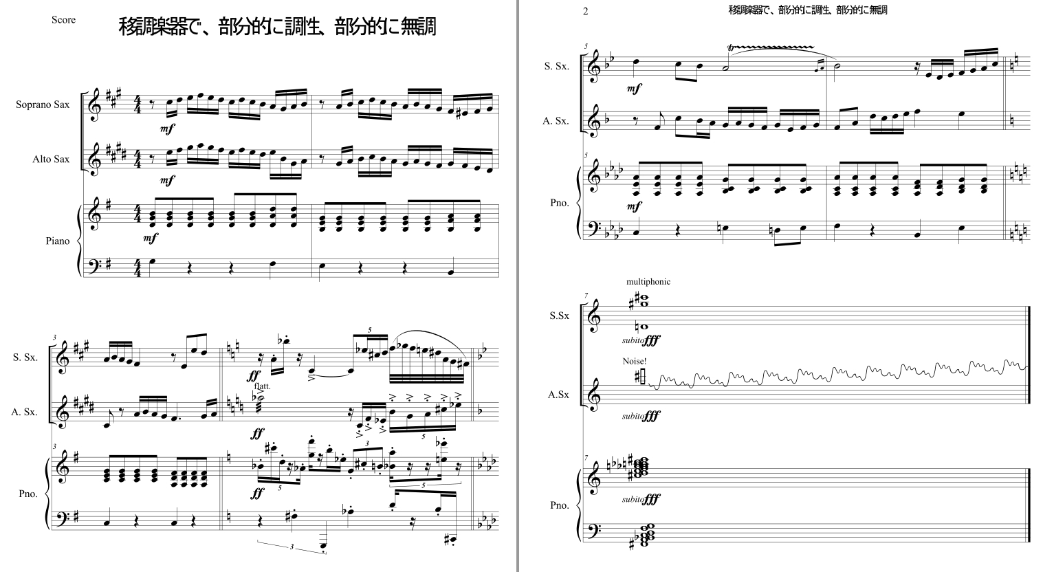 Finale2012 English版譜例を見ていただければわかるかとおもいますが、一曲を通してではなくて、曲の中で無調の部分と調性の部分があるとします。この例ではソプラノサックスin B♭、アルトサックスin E♭が入っています。この譜例をどうやって作成したかというと、かなりの荒業ですが、途中で楽器を変えて、無調の部分はBbクラリネット、Ebアルトクラリネットにして、スコアマネージャーで「クロマティック」の移調にした後、パート名を「S.Sx」「A.Sx」に書き換えています。調性の部分はデフォルトのままです。調性(この譜面ではGdurおよびAsdur)から無調へ「転調?」するときのナチュラル調号は欲しいのです。それでなおかつ、その部分だけは移調楽器にかかわらず調号なしにしたいのです。こんな荒業以外にもっとスマートな方法はないのでしょうか?